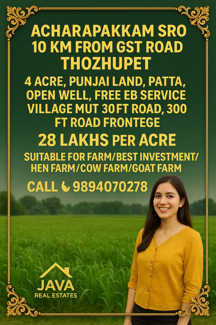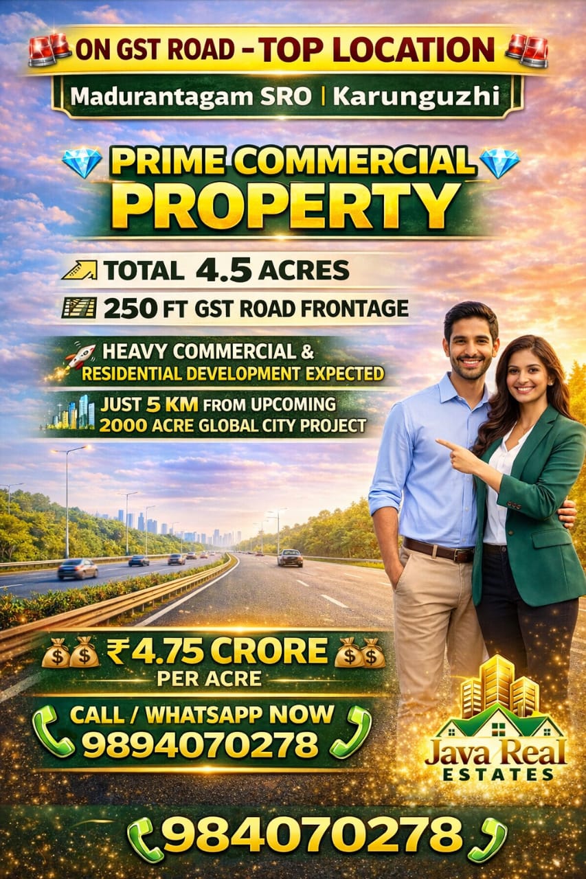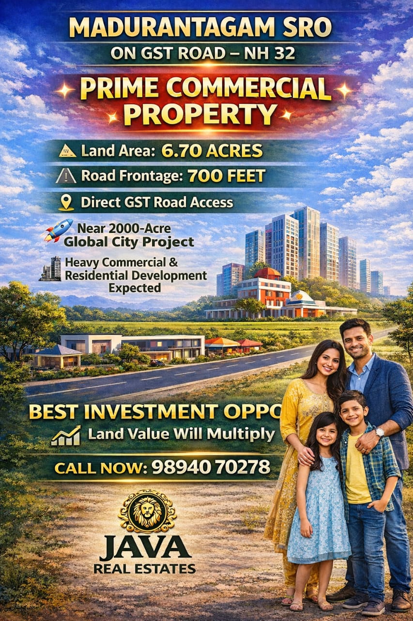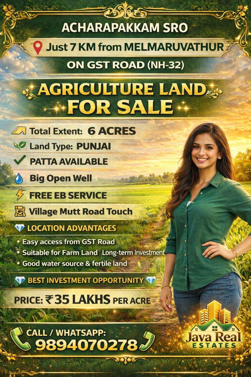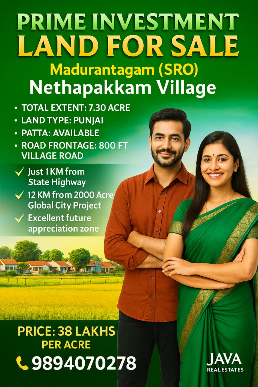 Java Real Estates is a trusted real estate consultancy based in the Madurantakam region, specializing in farm lands, agricultural lands, and prime commercial properties. We help buyers and investors find the right property with transparency, clear guidance, and the best market options.