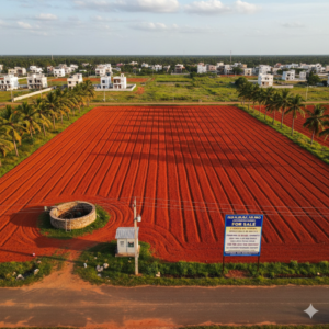 Premium 4 acre punjai land for sale in Acharapakkam SRO region. The property has red soil and comes with open well and free EB service (as per poster). Located in a developing zone with nearby houses, making it suitable for long-term investment and future development. Clear title property with full support in documentation and registration.